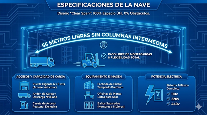 🚫 Cero Obstáculos (55m Claro Libre): Nuestra estructura sin columnas intermedias garantiza el